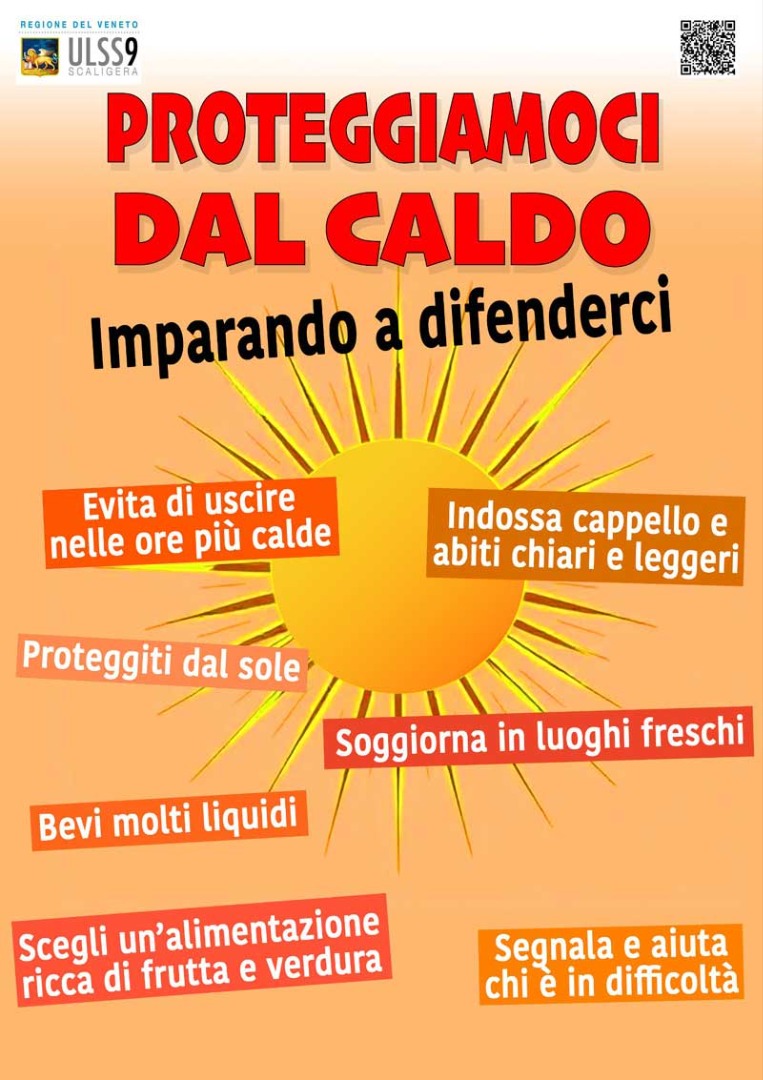 Nei mesi più caldi dell’anno, è importante prestare attenzione anche per la prevenzione dei danni dal cosiddetto “colpo di calore” che può causare gravi conseguenze soprattutto in soggetti fragili e/o con fattori di rischio (bambini piccoli, anziani, persone affette da alcune malattie croniche cardiovascolari, ecc). Per conoscere i migliori consigli per contrastare l’emergenza caldo e proteggersi al meglio, ti invitiamo a consultare l’opuscolo predisposto dalla nostra AULSS. Per informazioni CLICCA QUI.